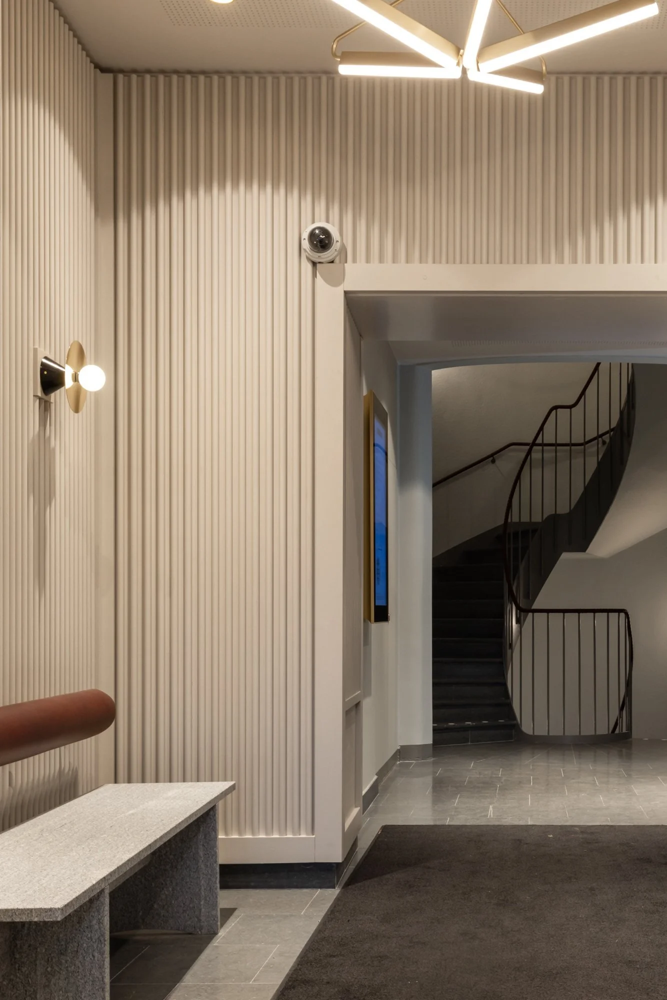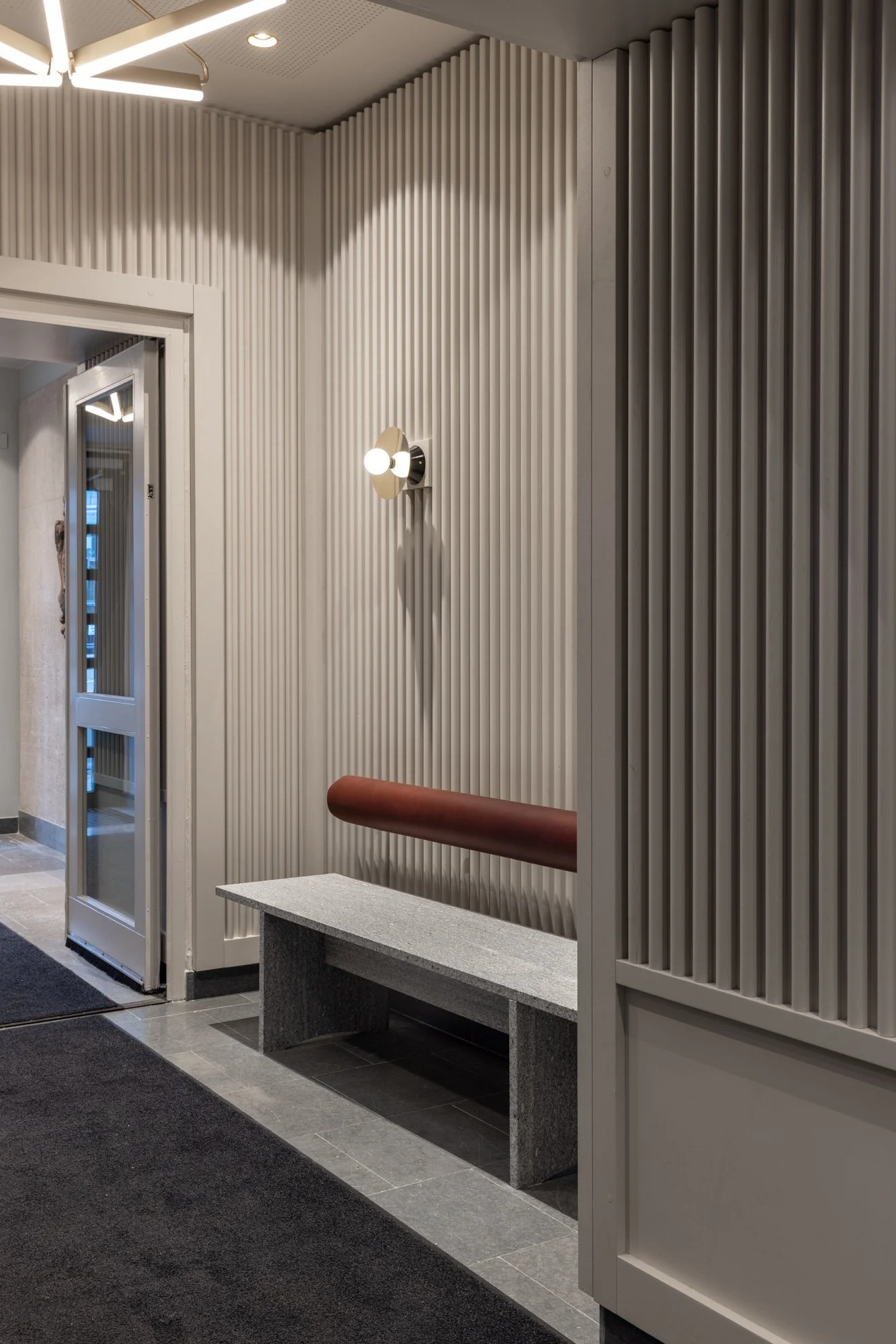 Nytt inredningskoncept för entréhall, hiss och trapphus i kv. Achilles på Slussplan 1 i Gamla Stan. Fastigheten är har anor från 1600 talet och det nya konceptet förstärker äldre kvalitéer samtidigt som nya byggdelar och inredningsdetaljer adderas i harmoni med husets äldre själ.