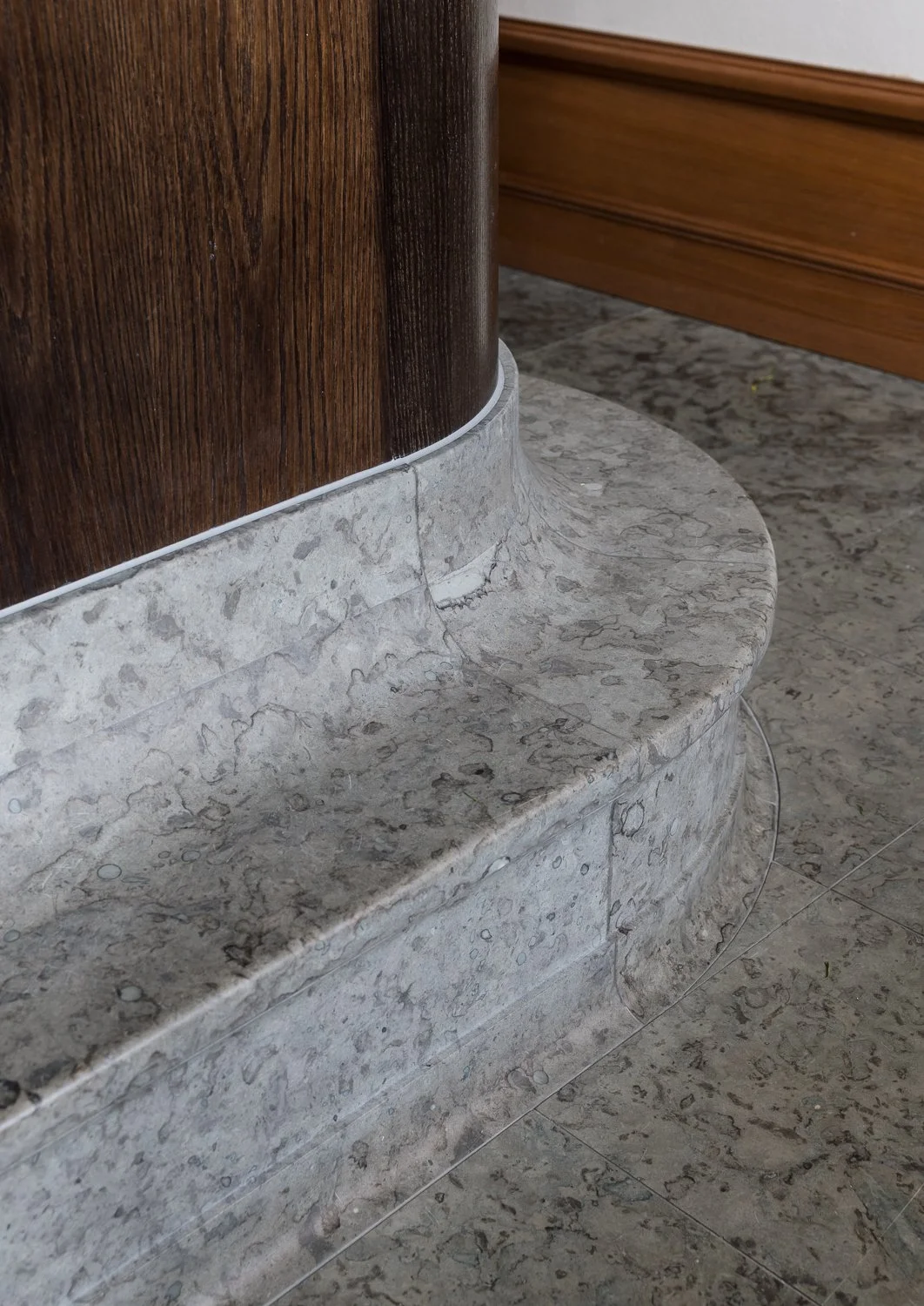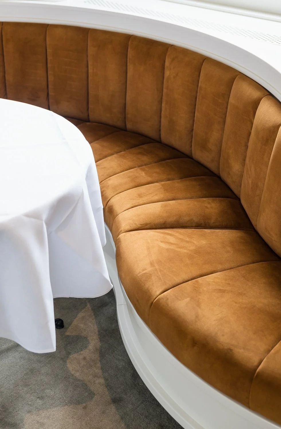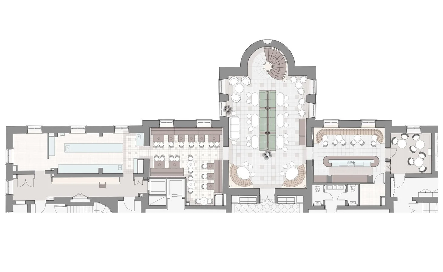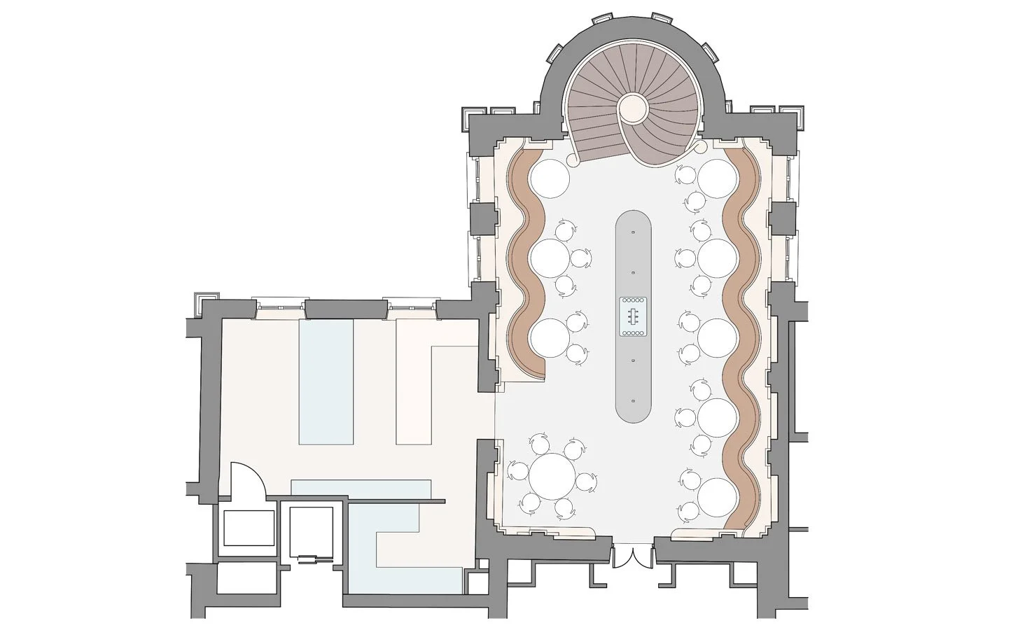 Men så finns det de besökare som vill åt något alldeles extra. Dessa är på väg rakt igenom loungen upp för den vindlande trappan genom kyrksalens gamla kor. Den första anblicken av rummet där uppe, den exklusiva restaurangen, är magisk. Många delar av rummet är original från den tid då detta var byggnadens kyrksal. Joniska pilastrar, guldänglar, medaljonger med kors och valv. Rummets väggar marmorerades till stor del, dess bladguldsdetaljer bibehölls och i övrigt bäddades salen in i en varmvit sammanbindande kulör. Det första en hungrig gäst ser när hen kommer upp för trappan är en stor arrangé som likt ett altare står mitt i rummet omgiven av en kalkstensö i golvets annars mattbeklädda yta. Kring denna pjäs, med rundade gavlar, kalkstenssockel och kalkstensbänksskiva, arbetar restaurangens servitörer. Två vinglasrack står upp från altaret utformade så att glasen utgör kristallerna i en stor armatur. Längs väggarna snirklar sig en stoppad soffa i rytm med pilastrarna från vägg till vägg som ett färgstarkt band. Rumets fyra fönster kompletterades med spegelblindfönster i de övriga nischerna vilket fick rummet att växa betänkligt samtidigt som det ger en känsla av symmetri som arkitekten Paladio troligen hade uppskattat. Längst in i rummet på glashyllor i nischerna står de finaste dryckerna och inspirerar till en välsmakande afton tillsammans med nära och kära.