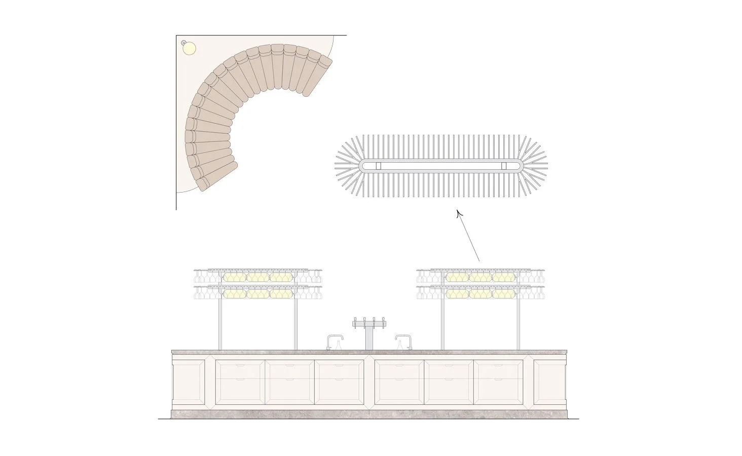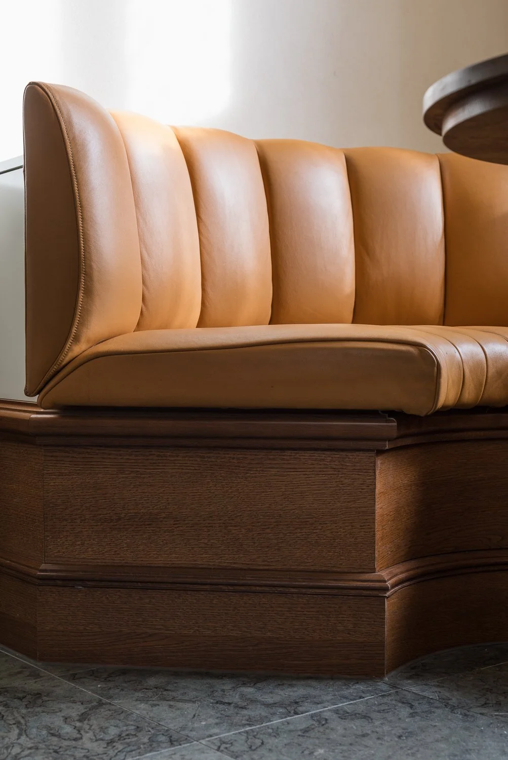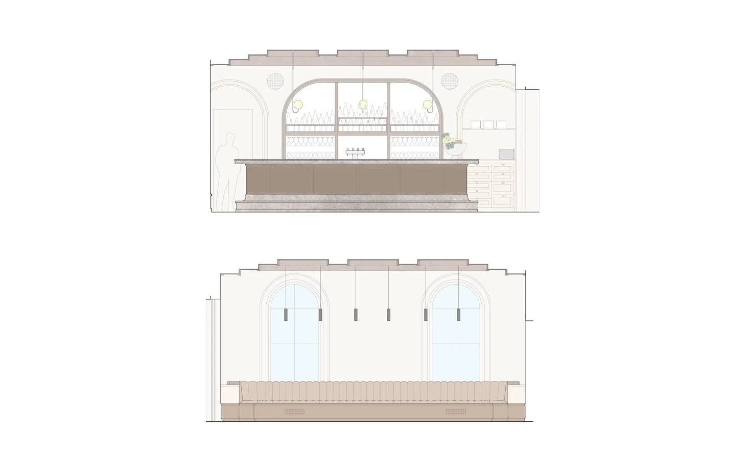 Vidare till höger ligger baren. Ett grått kalkgolv viker upp och bildar bardiskens fotstöd. Den mörka baren ser ut att vila på ett fundament från husets tillkomst. Backbarens valv speglar fönstren mitt emot. Mittenvalvet tornar upp sig som en belyst kyrka där flaskorna speglar sig mot ryggen. Barsoffan går från vägg till vägg och ligger på den höga 1800-tals golvsockeln, känslan blir nästan en rokokomöbel. Sedan ser besökaren upp i taket, en pyramidform med röd kalksten på kanterna, en flirt med arkitekten Loos ”Amarican Bar” i Wien. Alla ytor är putsade, baren känns helgjuten på något sätt. Innanför baren finns en liten speakeacy bakom en tapetdörr. Från detta rum kan besökaren beställa från baren genom en peaky blinders inspirerad lucka i en bokhylla.