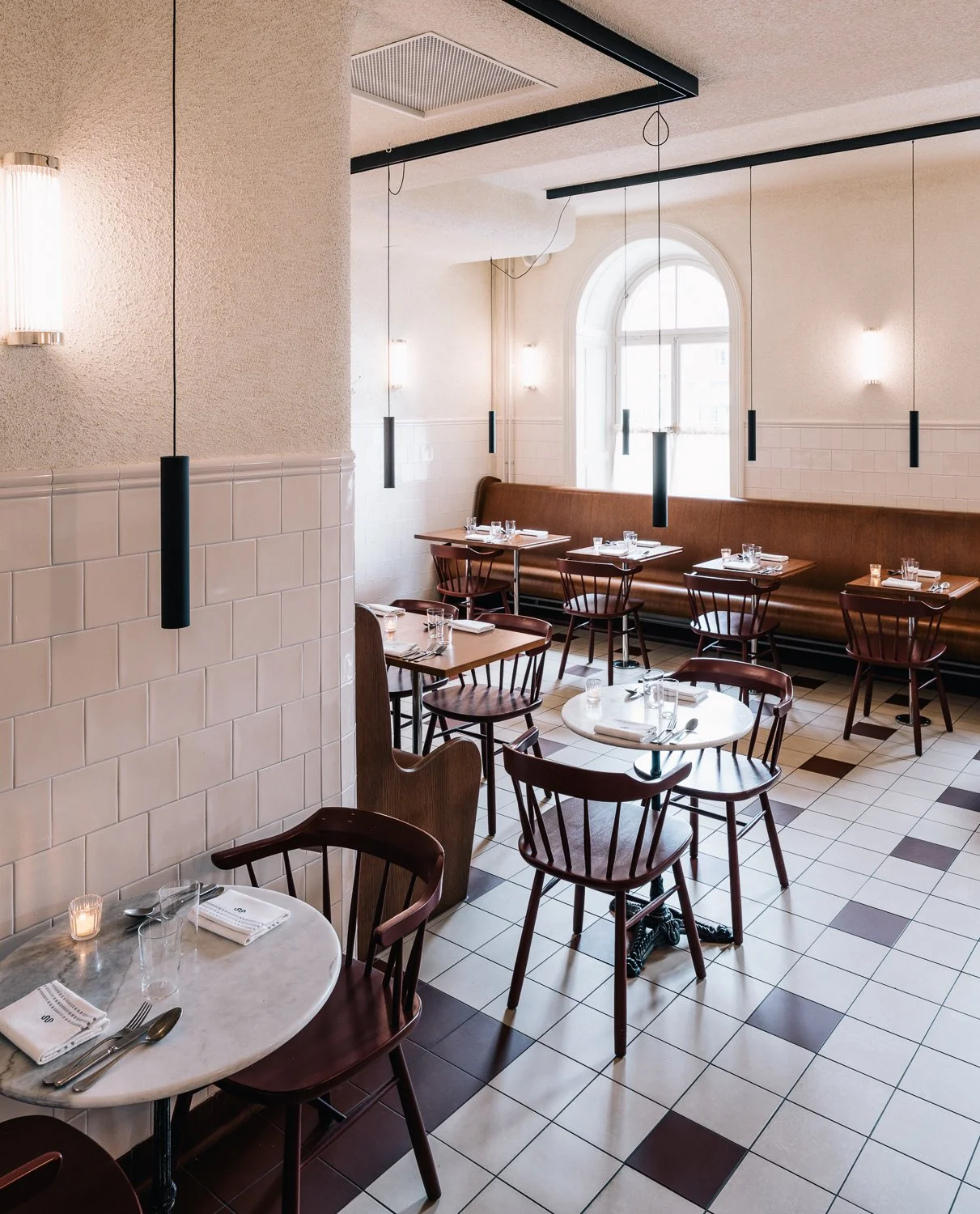 Men om besökaren kom för att äta en bit mat så viker denne antagligen av åt vänster från loungen in i bistron. Här byter golvmaterialet till klinker i sekelskiftes varmvita och rödbruna kulörer. Detta golv vandrar vidare in i det öppna storkökets serveringsdel och binder ihop rummen. Golvmönstret är samma som loungens kalkstensgolv men småskaligare. Väggarna är klädda i blankt kakel och avslutas med två bröstningslister. Väggar och tak är sprutat med akustikputs vilket ger en rustik känsla samt en akustiskt mjuk miljö. Längs väggarna är mörka organiskt formade träsoffor väggmonterade. Bultade bord med iläggsskivor skapar stor flexibilitet.